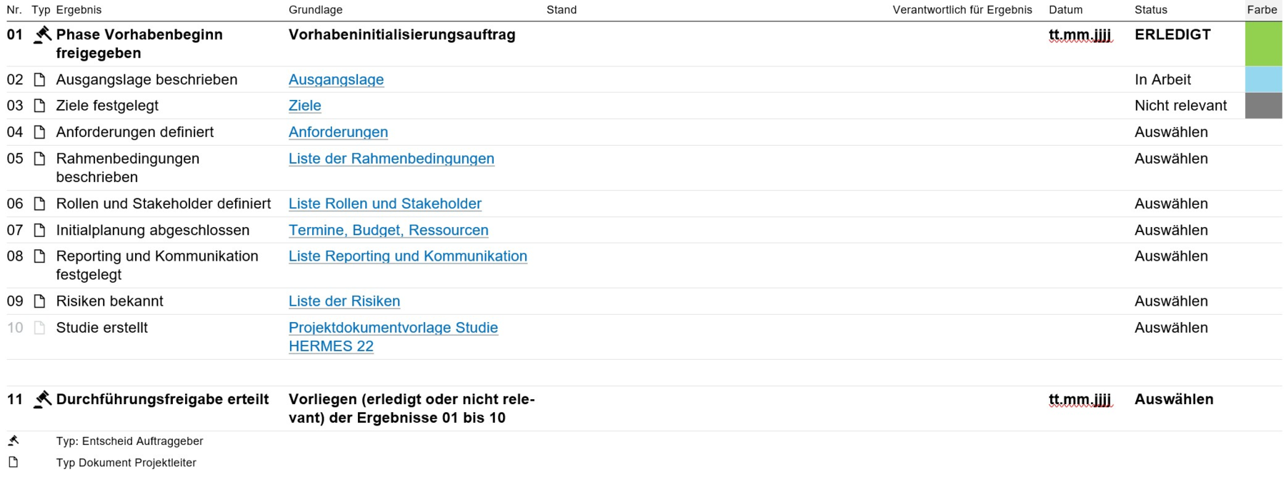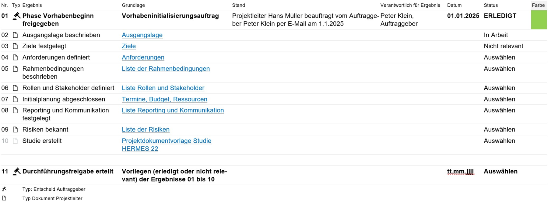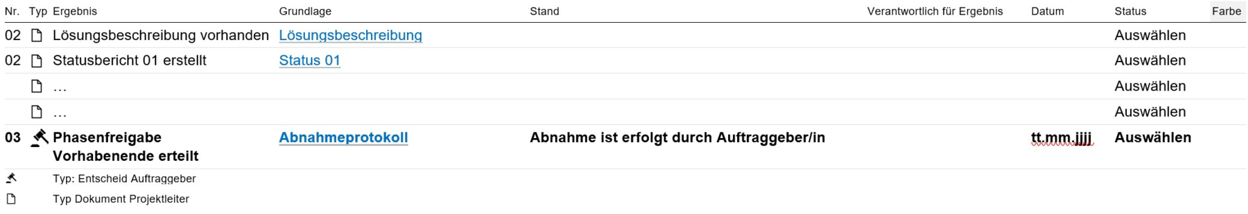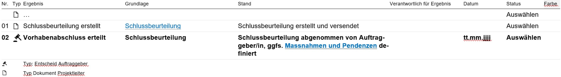 Arbeiten Sie die Zeilen sequentiell durch. Sie können eigene Zeilen ergänzen für Ihre individuellen Lieferergebnisse. Dazu bitte die Nummerierung der Zeilen anpassen. Die letzte Zeile ist immer der Entscheid für den Eintritt in die Phase "Vorhabenende". Für diesen Entscheid müssen alle vorangegangenen Tasks erledigt sein ("erledigt" oder "nicht relevant" mit Begründung).