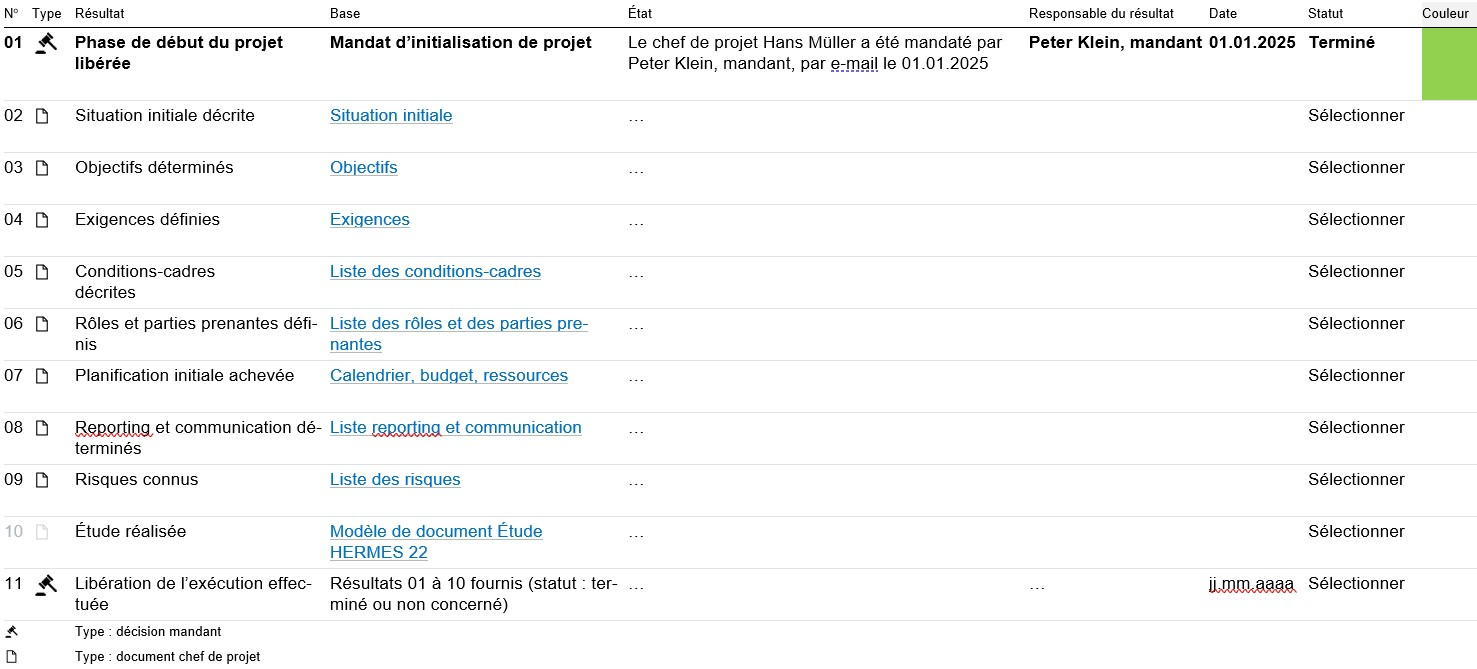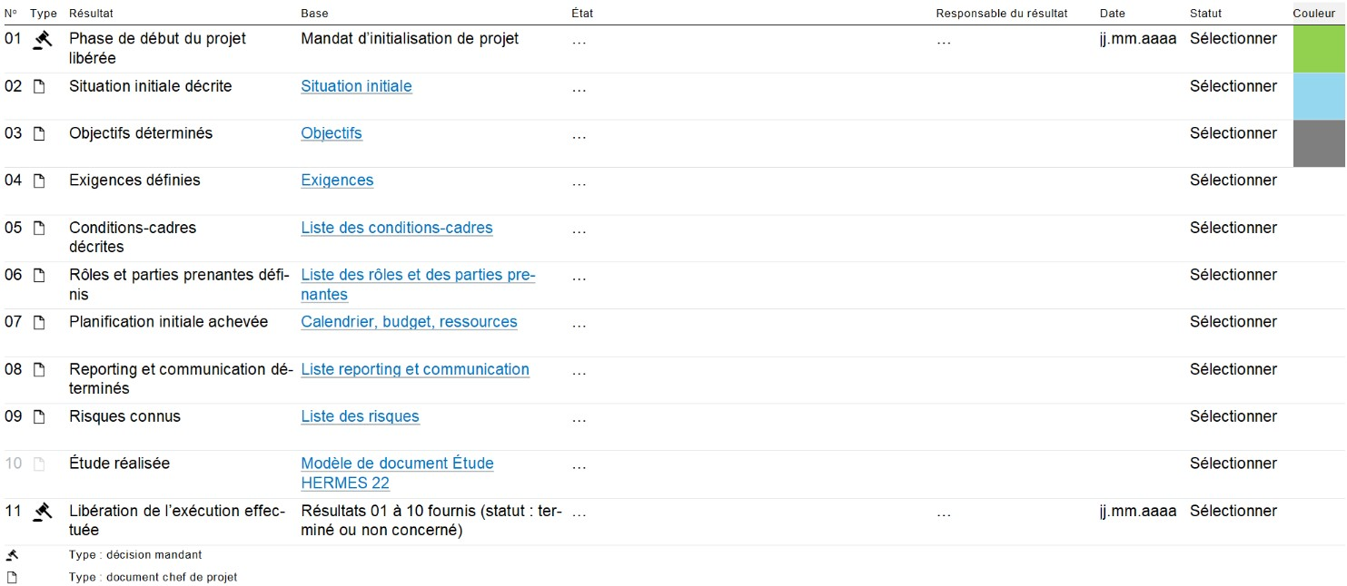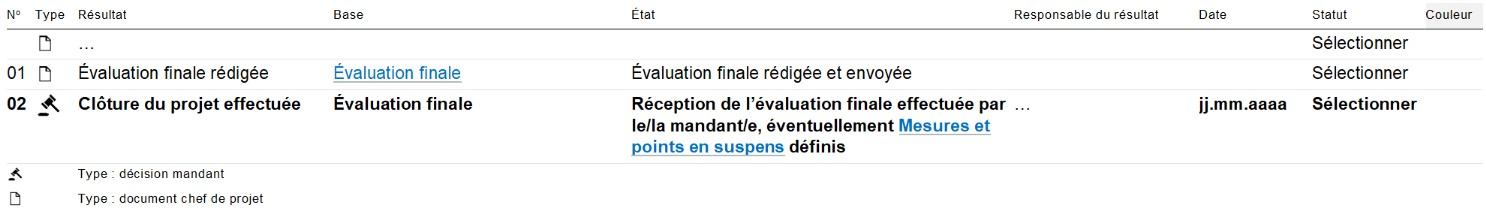 Avancez d’une ligne à l’autre de manière séquentielle. Vous pouvez ajouter des lignes correspondant aux résultats que vous devez vous-même fournir. Pour cela, pensez à modifier la numérotation des lignes. La dernière ligne correspond toujours à la décision d’entrer dans la phase « Fin du projet ». Cette décision ne peut être prise que si toutes les étapes précédentes ont été effectuées (statut « Terminé » ou « Non concerné » avec justification).